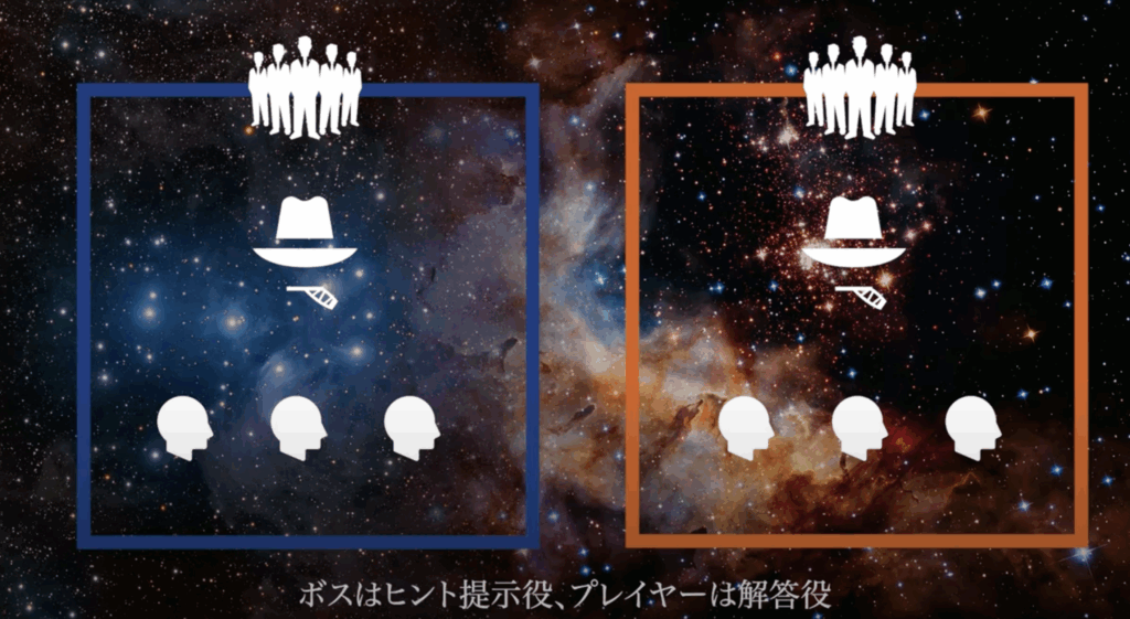 「スパイマスター(ヒントを出す人)」と「諜報員(ヒントをもとに単語を選ぶ人)」がいます。